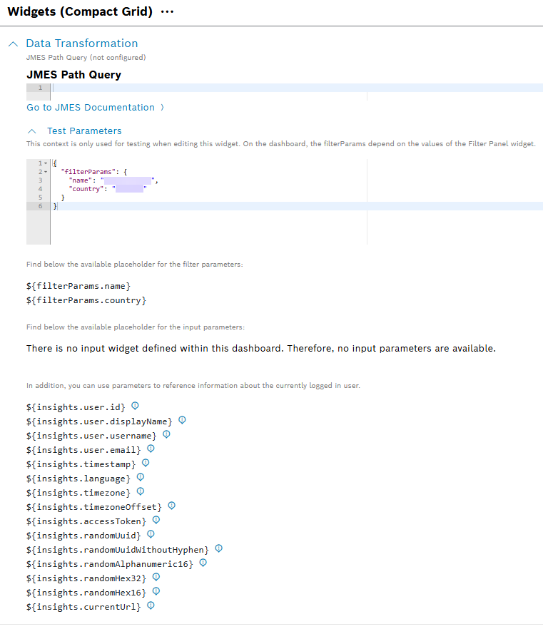 You can configure your JMES Path Query from the Data Transformation pane. When editing a widget, you can view all available placeholders in the Test Parameters tab. See the example below::
