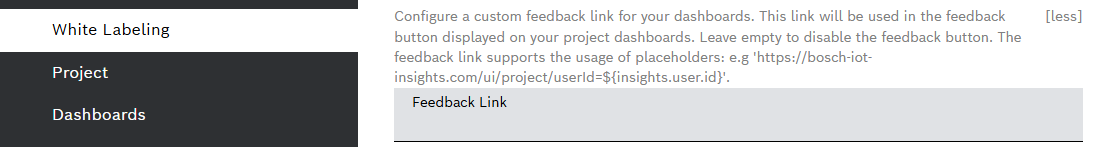 Navigating to Admin > White Labeling > Basic Settings allows you to configure a feedback banner link for your dashboard. Now, the feedback link supports placeholders as the one of $(insights.user.id) in the example below: