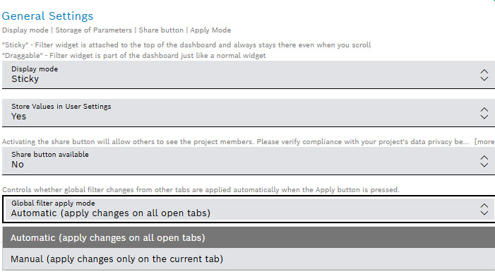 Now, any changes to global filters are only applied and executed when the Apply button is pressed. A drop-down menu – Global filter apply mode – allows users with administrative rights (widget configuration rights) to enable or disable the non-automatic filter behavior.