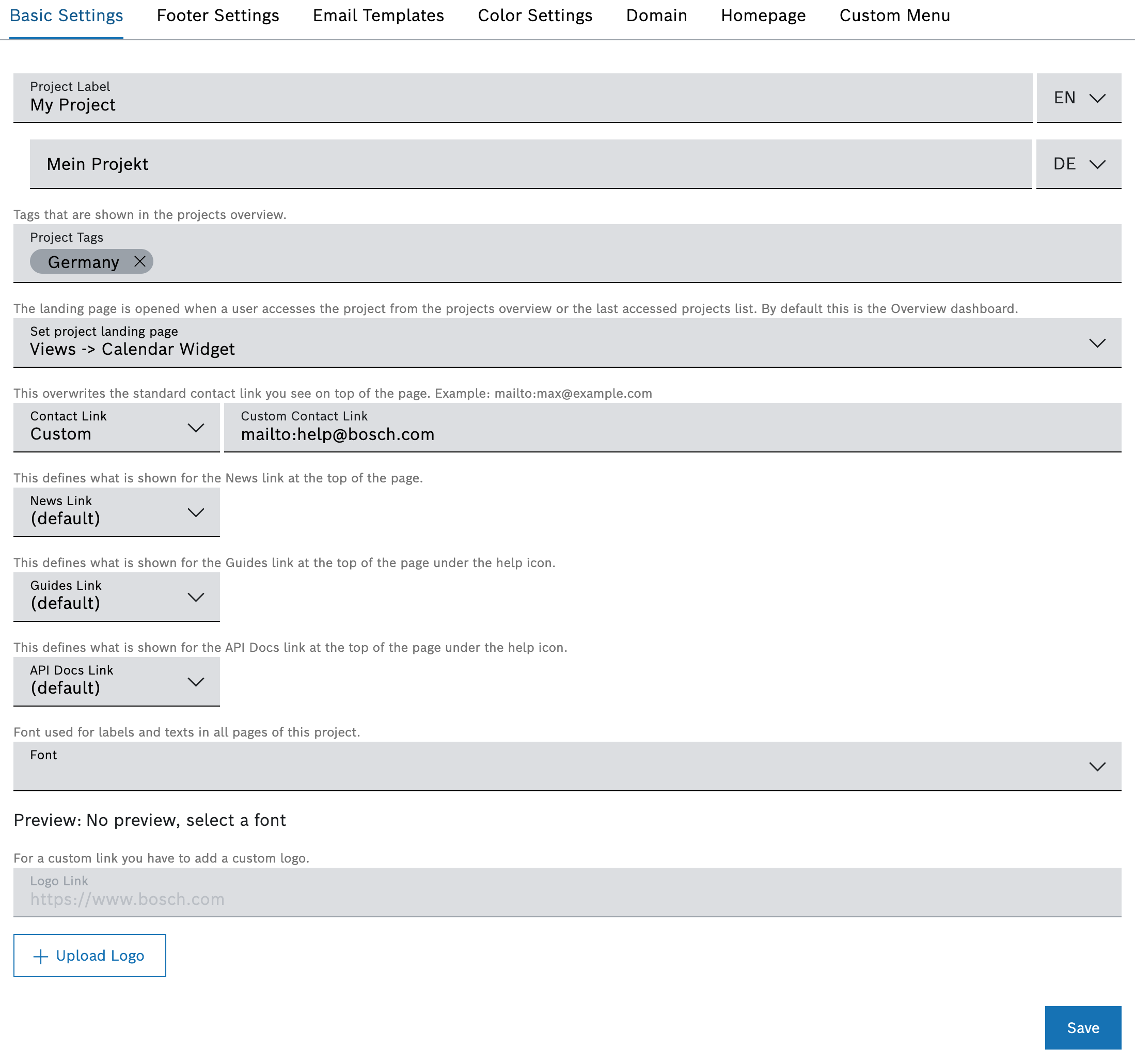 In the Basic Settings tab of White Labeling, you can define the project's label, tags, landing page, contact information, links, font, and logo.