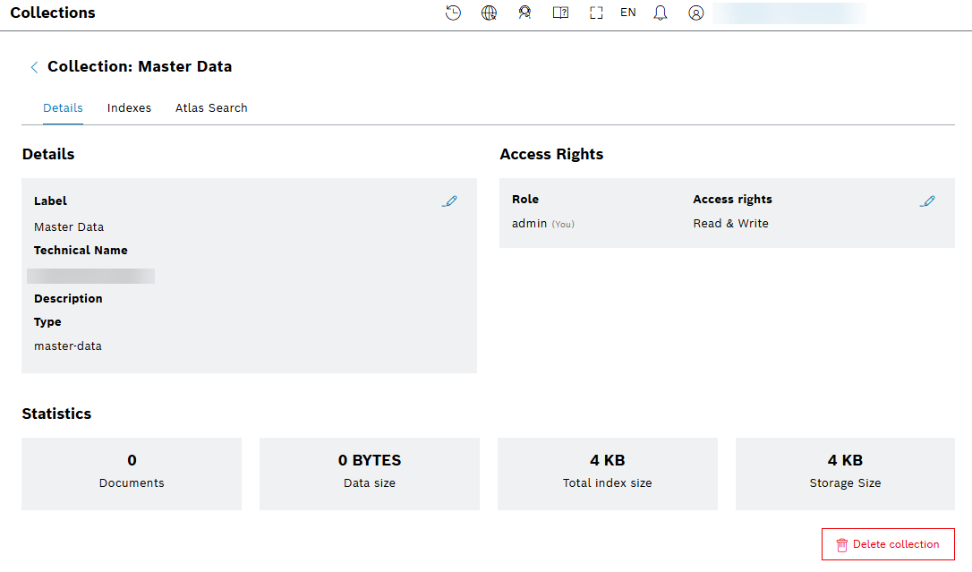 Selecting the name of a collection from a table, opens the Details view, which includes information about the Label, Technical Name, Description, and Type of the selected collection. The data from the Statistics refer to the number of documents, and the sizes of data, total index and storage: