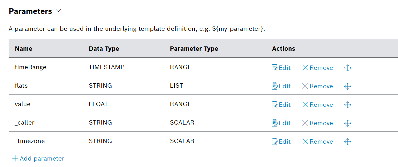 → The parameters should look like this: - In the Template Definition section, enter the following query: