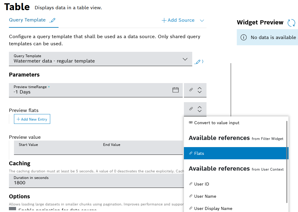 - For each of the Parameters of the data source, add the Available references from Filter Widget.