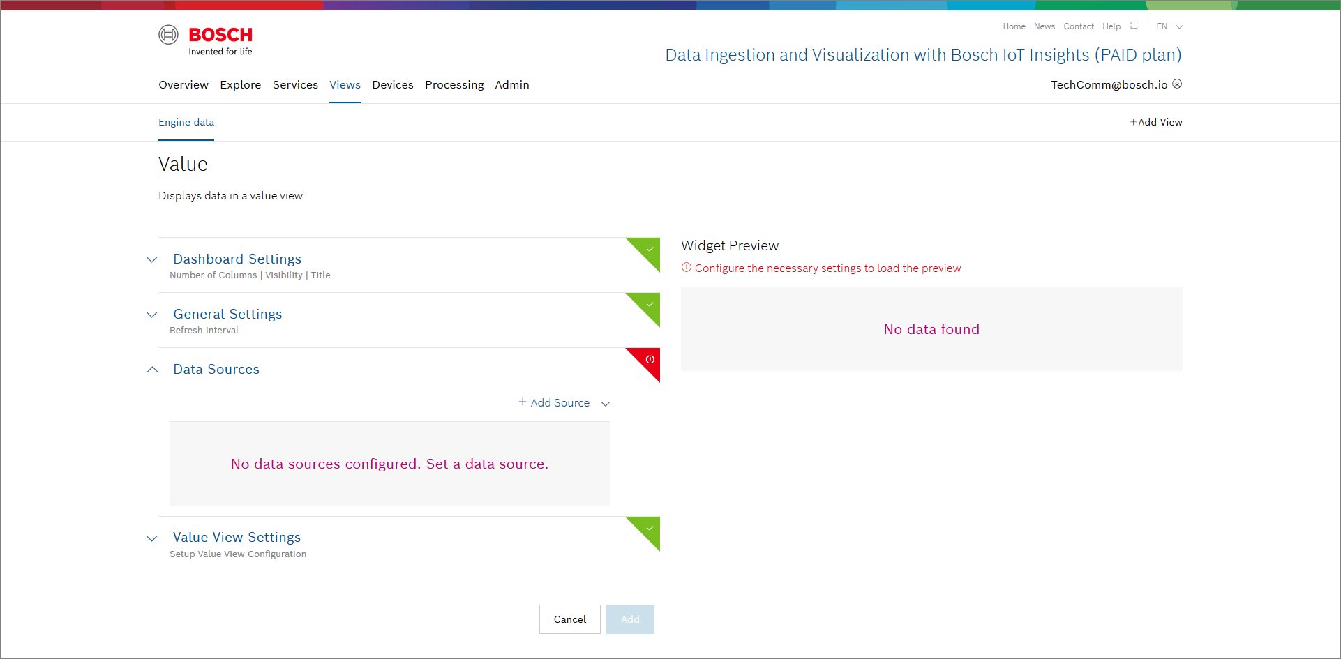 There are many ways to ingest device data in Bosch IoT Insights. One way is to use a free plan of the Bosch IoT Device Management. This tutorial explains - as a first step - how you connect the service package with your project. Using an API development platform, we will send device data to Bosch IoT Insights via the Bosch IoT Things' HTTP API. In a last step, we will create a Value widget that shows the received data.