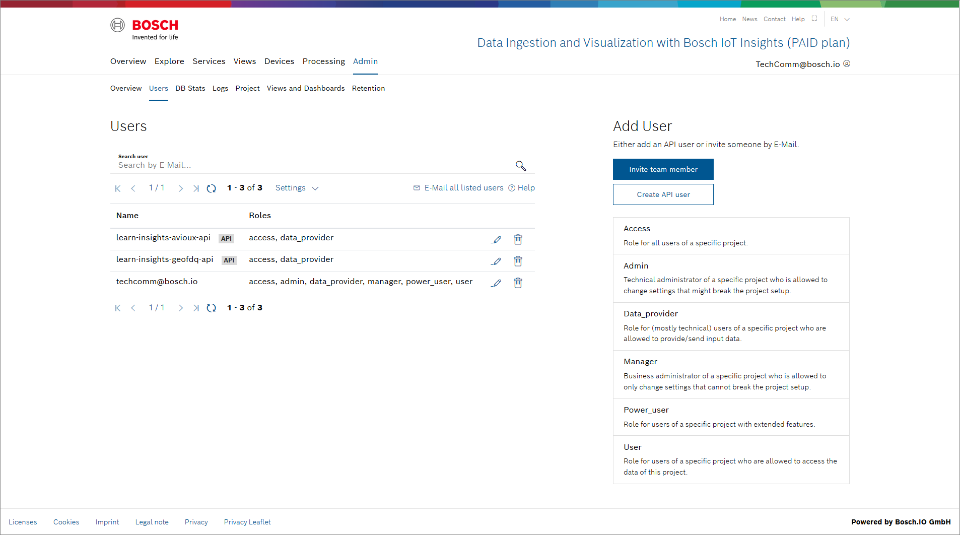 To establish the connection between Bosch IoT Device Management and your Bosch IoT Insights project, the credentials of an API user are required. In Bosch IoT Insights, an API user serves as a data provider.