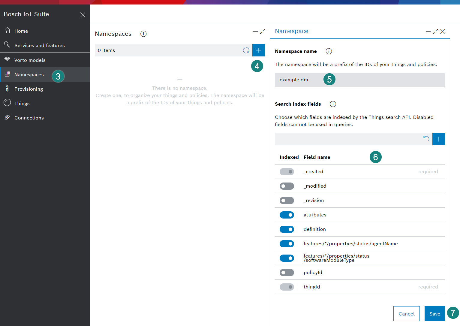 However, it needs to be unique, i.e. you cannot register the exact same namespace for multiple instances. - The search index fields are set to the defaults which are most convenient for Bosch IoT Device Management to work properly.