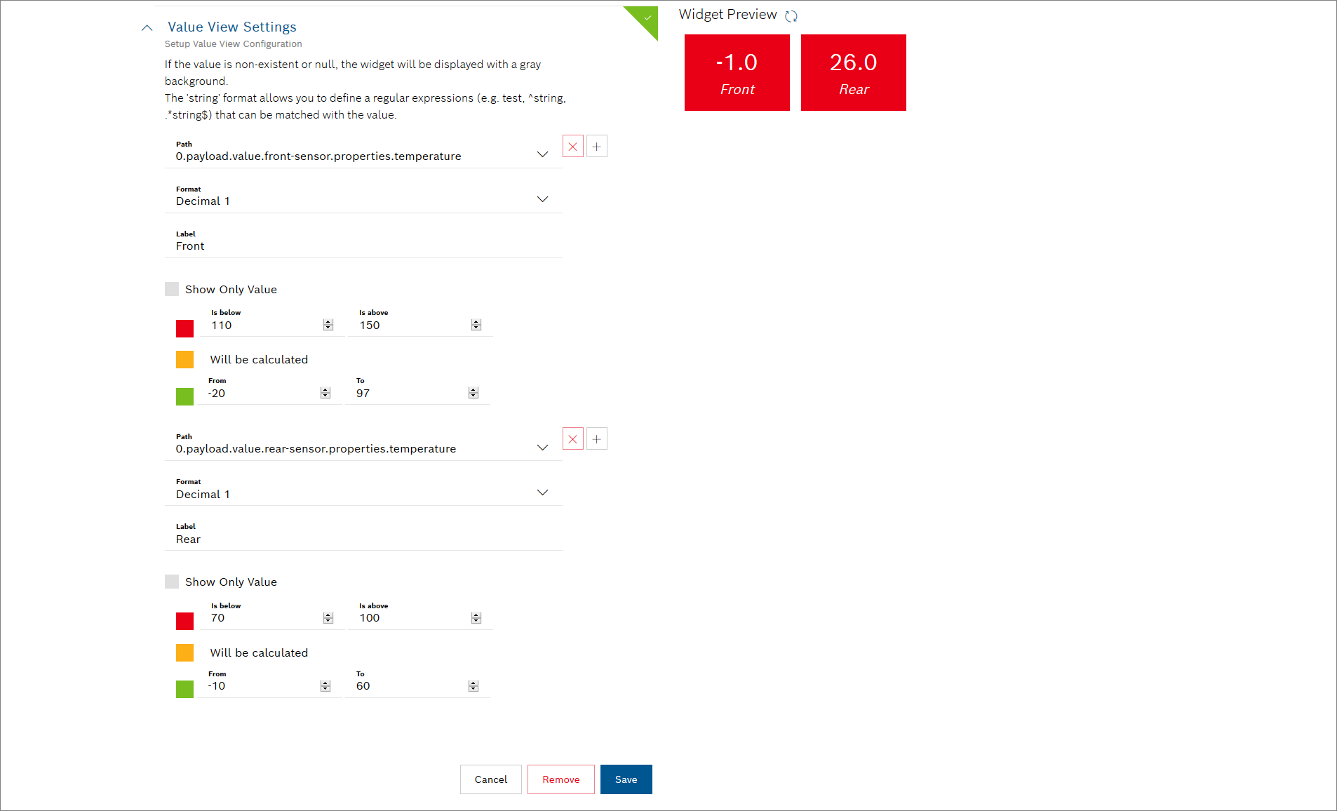 0.payload.value.rear-sensor.properties.temperatureparameter path.The number in the beginning of the parameter path refers to the document number in the data source. The 0 in the example above means that the first document of the data source is considered.