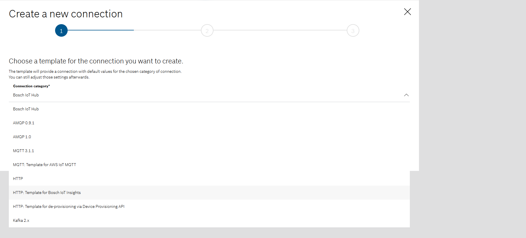 → The Create a new connection dialog is displayed. - Use the drop down and choose HTTP: Template for Bosch IoT Insights.