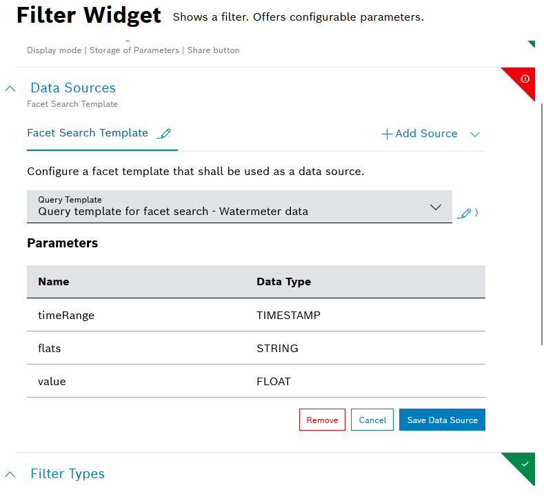 → The filter parameter is added and can be configured as described in the following sections.To remove a parameter, click the Remove Parameter button at the bottom of the corresponding filter parameter.