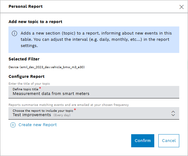 → A notification message appears stating that the topic has been added successfully to the report you have selected: - Upon that, when the configured interval is reached, you will receive an email notification about the generated report.