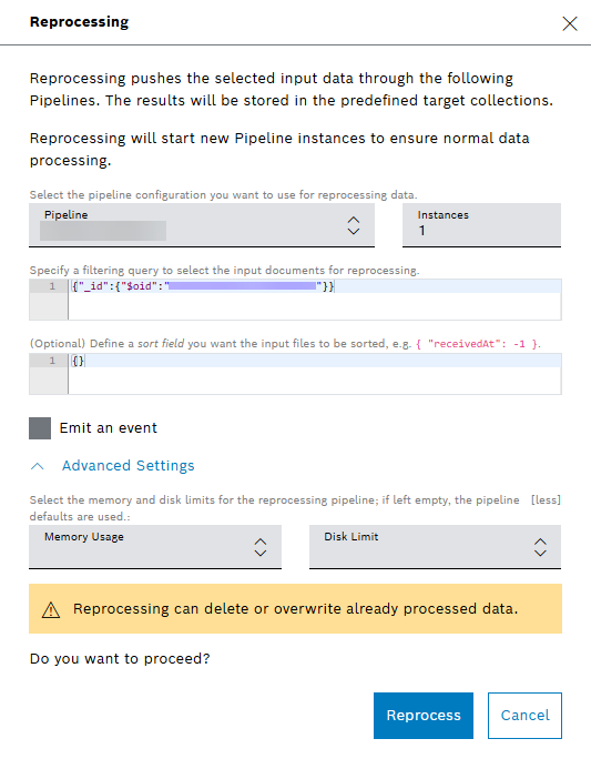 When the number of documents exceeds 1000, reprocessing is disabled with a hint that there are more than 1000 input data entries: