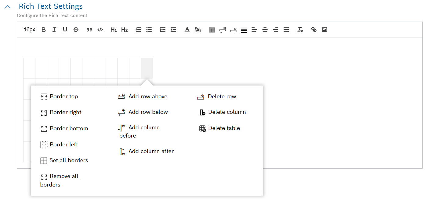 → Use the respective buttons to adjust the table borders, add and delete rows and columns, as well as to delete the entire table. - Add any relevant content to the table, such as: