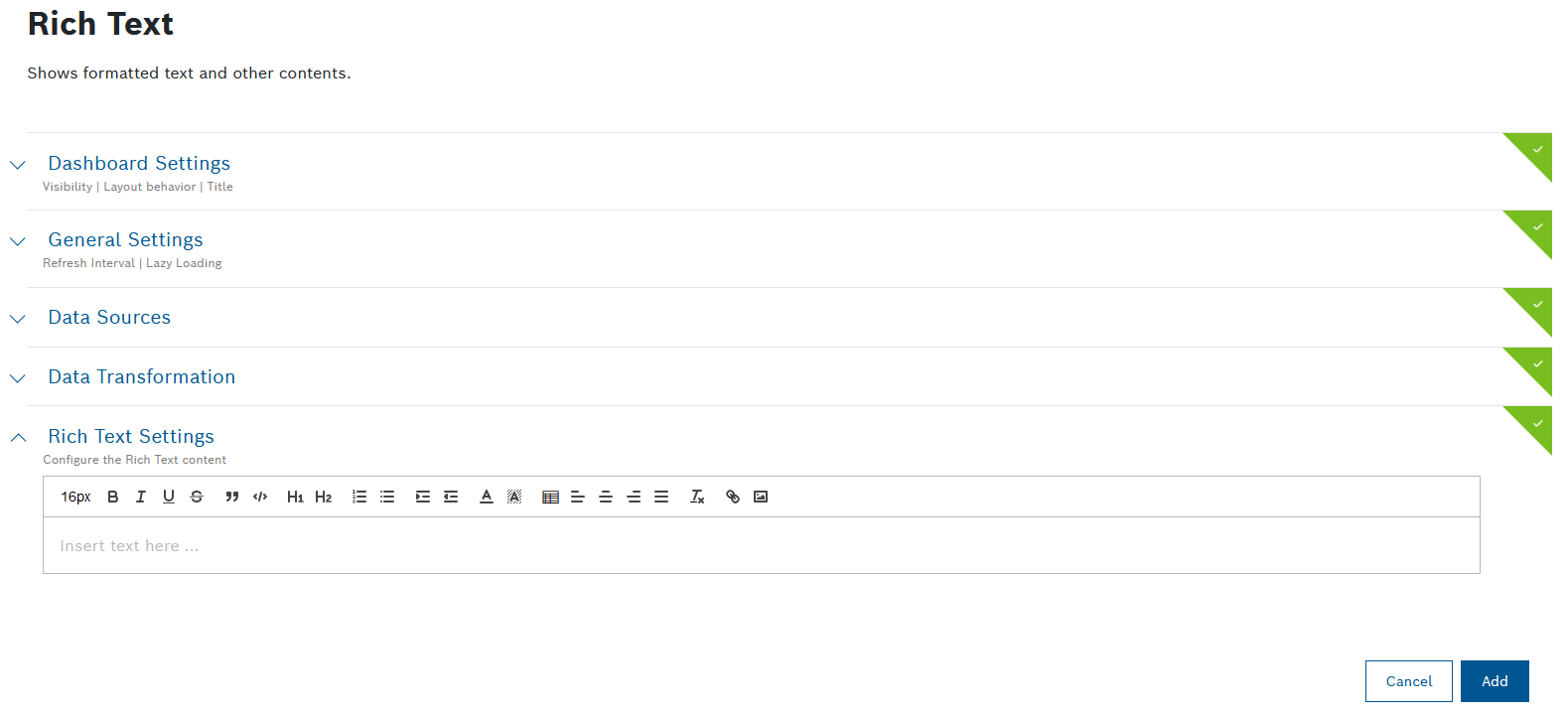 The configuration of a data source in the Rich Text widget is optional. If you want to use placeholders, it is necessary to define a data source.