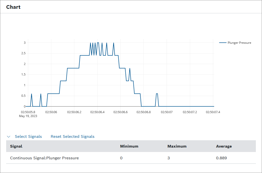 Using the Signal Chart widget, data is loaded and displayed when necessary. The data is displayed as a line based on connected points which represent the coordinates for the x-axis and y-axis. In most cases, a combination of time (x-axis) and another signal, e.g. pressure or temperature (y-axis) is used. The configured preselected signals are always displayed in the chart. It is also possible to display other signals by selecting them from the table under the chart, where all available signals are listed. You can select and deselect signals one by one or all at once.