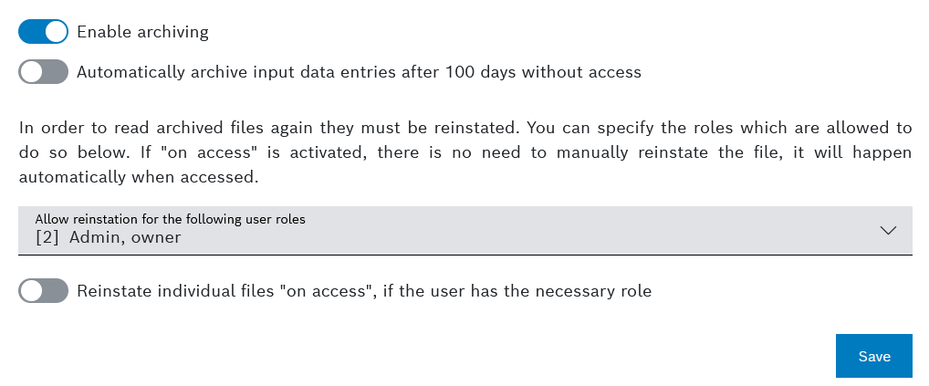 → If you choose to not enable this toggle, all the files can still be archived manually. - From the drop-down menu called Allow reinstation for the following user roles, select the roles within the project which will be allowed to reinstate already archived files. Be aware, that this includes also rights to cost-generating early reinstating as well.