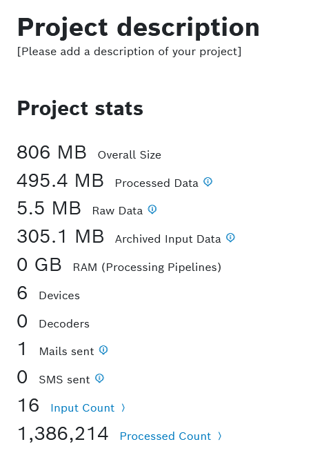 To check the volume of archived data, go to Overview on the left navigation and check the Archived Input Data reported by the Project stats widget, which is pre-configured on the main dashboard.
