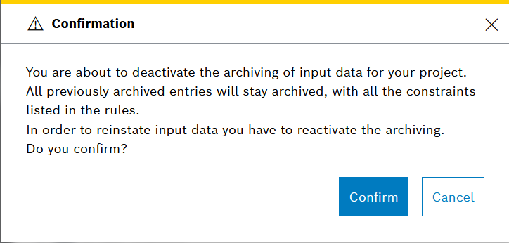 After the archiving feature has been enabled on project level, the respective input data entries can be moved to a long term archive, which provides a cheaper storage price. The input data will remain archived for at least 90 days and in that period there will be no direct access to it. However, the meta information in the input history will remain queryable.