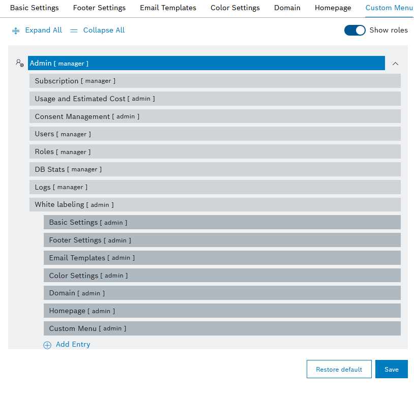 Use the Show roles toggle to show or hide from the current view the roles which have access to the specific menu items.
