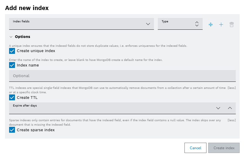 You can add index fields with button and reorder them later with button. It is possible to remove an index using the remove icon only if the index is added successfully.