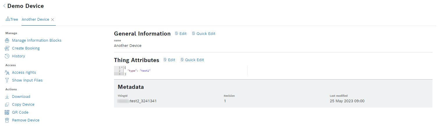 You can edit the general information of the device and add more information in the form of information blocks that have been configured for the device type the device belongs to.