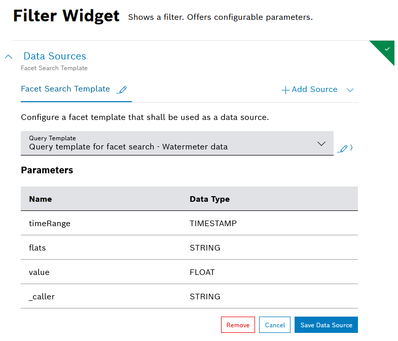 - In the filter widget configuration editor that opens, add a data source as follows: