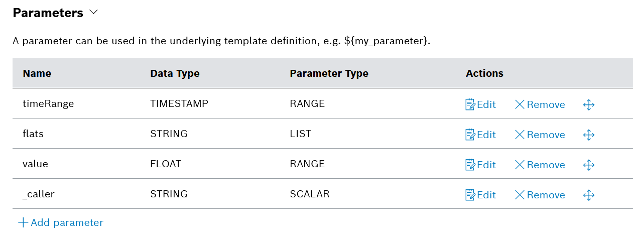 → The parameters should look like this: - In the Template Definition section, enter the following query: