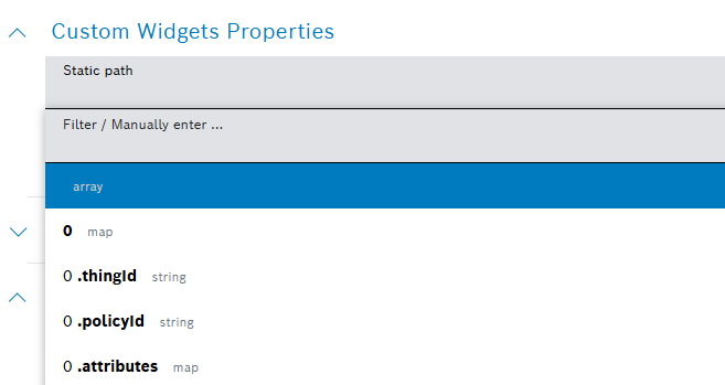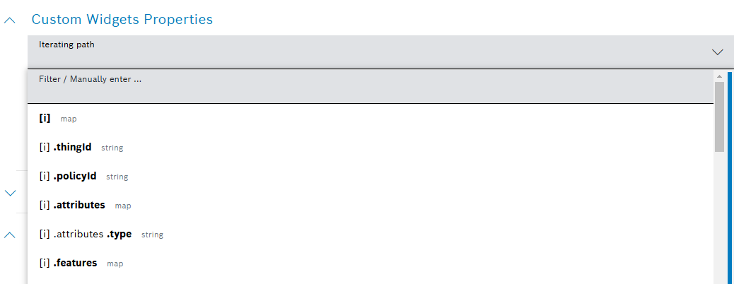 "map": {"label": {"en": "Country code","de": "Landesvorwahl"},"type": "map"}iteratingPathProvides a drop-down with iterating paths of the configured data source.