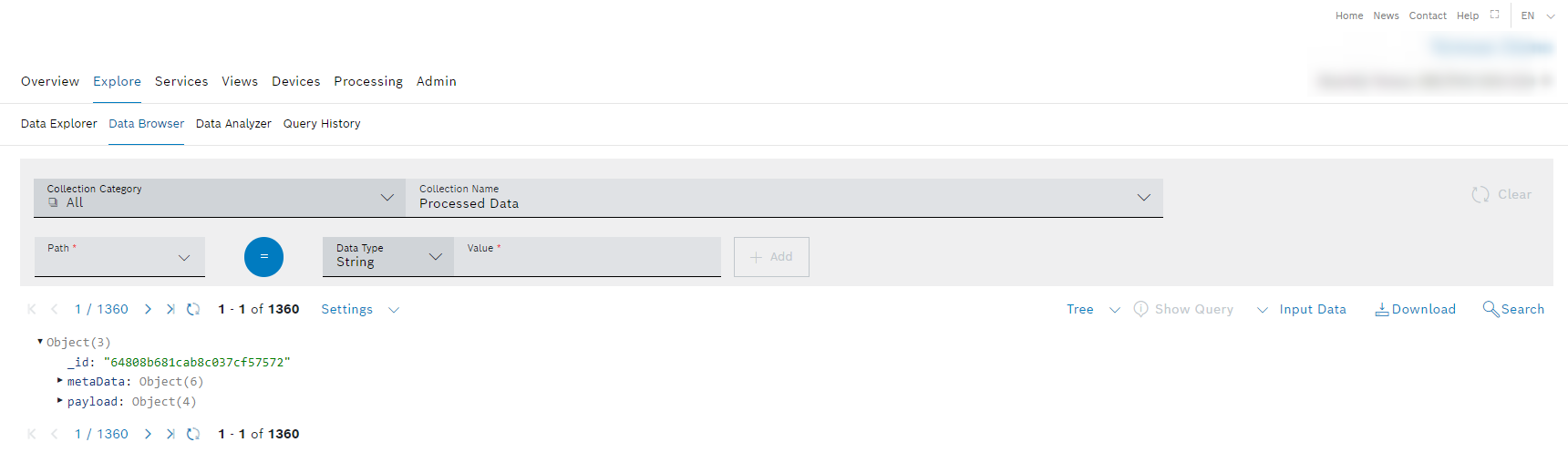→ The Data Browser is displayed. The Processed Data collection is selected by default and shows the processed data. - Click the Collection drop-down list to select another collection, e.g., Thing History or Calendar Events.