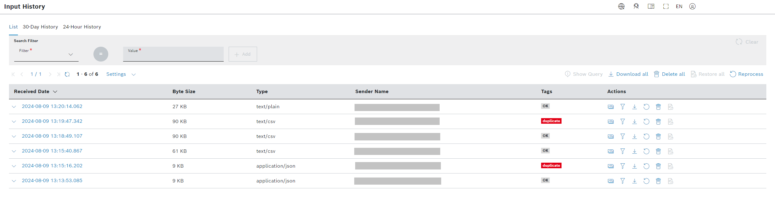Soft deletion applies. This means that any deleted input history entry is first disabled for a period of 7 days, and afterwards gets permanently deleted. In that period, the soft-deleted entries appear on the list in lighter gray and can be restored, both individually and as a group, i.e. all such items on the currently displayed page of results.