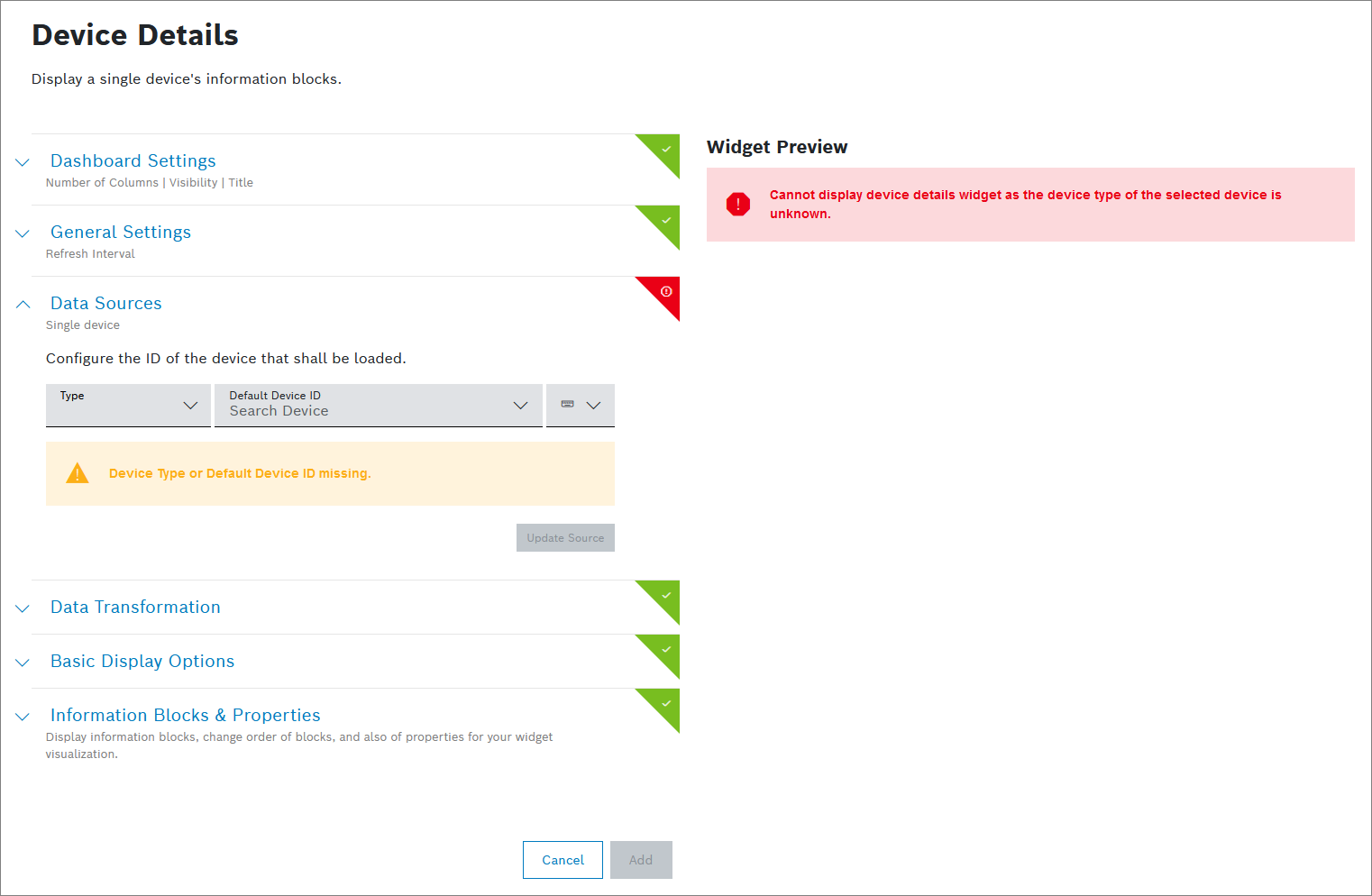 Using the Device Details widget, devices and their device information can be displayed in a widget. The information blocks you configured in Managing information blocks will be available for you to add.
