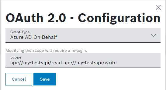 https://my-server.com/api/v1/testis configured as an external data source. This is the REST endpoint of the application. - The scope configured in the Azure Active Directory application is provided in the Scope field of the OAuth 2.0 configuration settings.