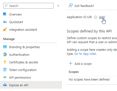 - Navigate to Expose an API and define the Application ID URI.
