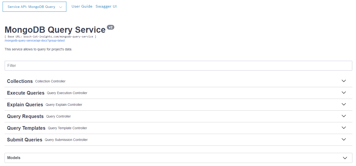 The MongoDB Query Service allows to execute MongoDB aggregation queries against the processed data of a project. Furthermore, some additional features, like storing query templates or providing on overview of the query history, are offered. A project can have more than one collection for processed data, hence the target collection needs to be given as well when executing queries.