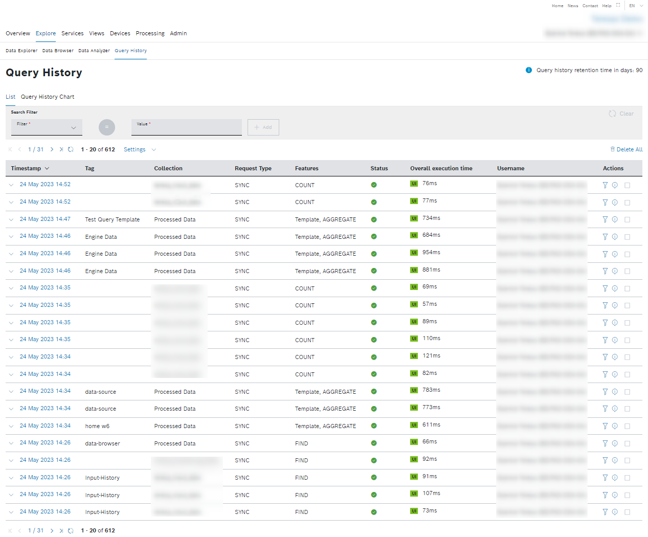 For each query template, you can review the Query History where you can see all queries and the details. You can also review the Query History Chart which provides an overview of the queued query time and the number of queries which had to wait for a read ticket.