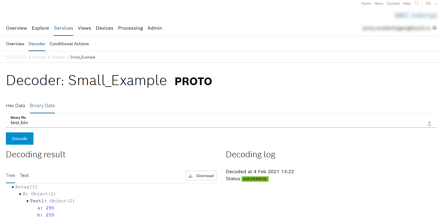 → In the Decoding result, the result is displayed either in tree or text format. The Decoding log provides the exact time and the status.Click the Download button to download the decoding result.