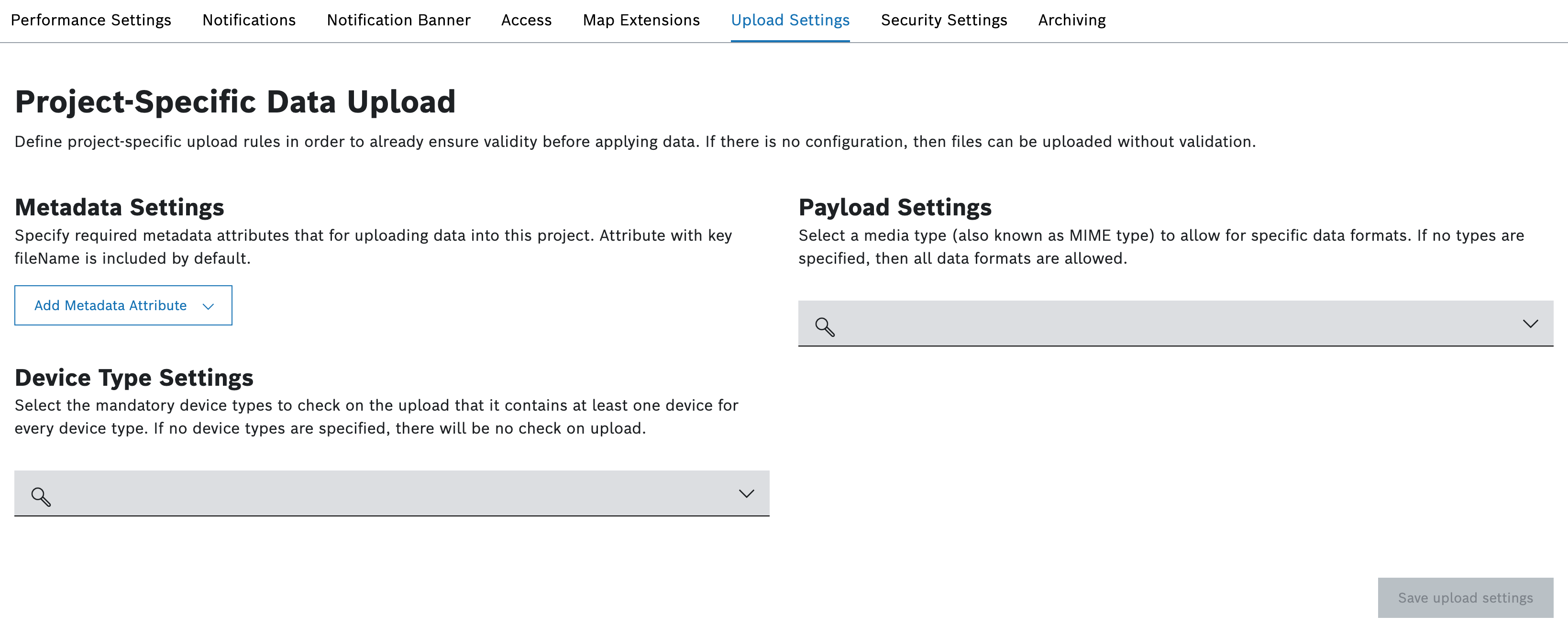 In Upload Settings, you can define project-specific rules for the data upload at Processing > Data Upload. With these rules, the data you upload will be validated. Upload rules can be defined for metadata and payload.