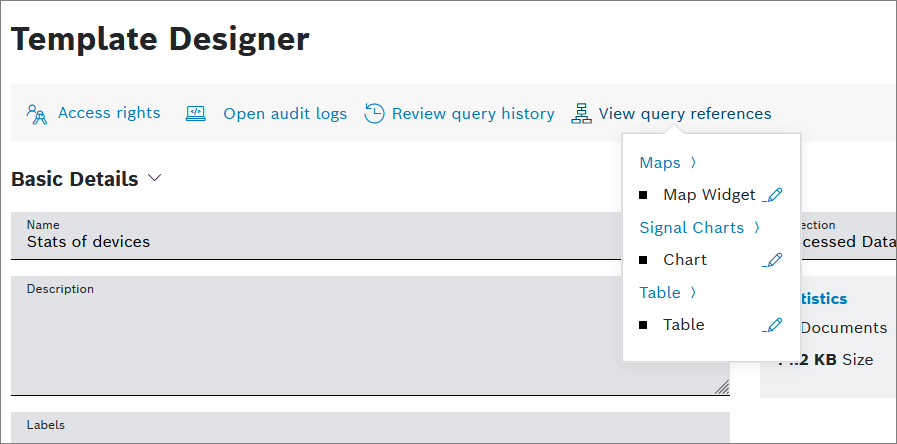 The references are grouped by the query template. All widgets that use a certain query templates are displayed. - Dashboards