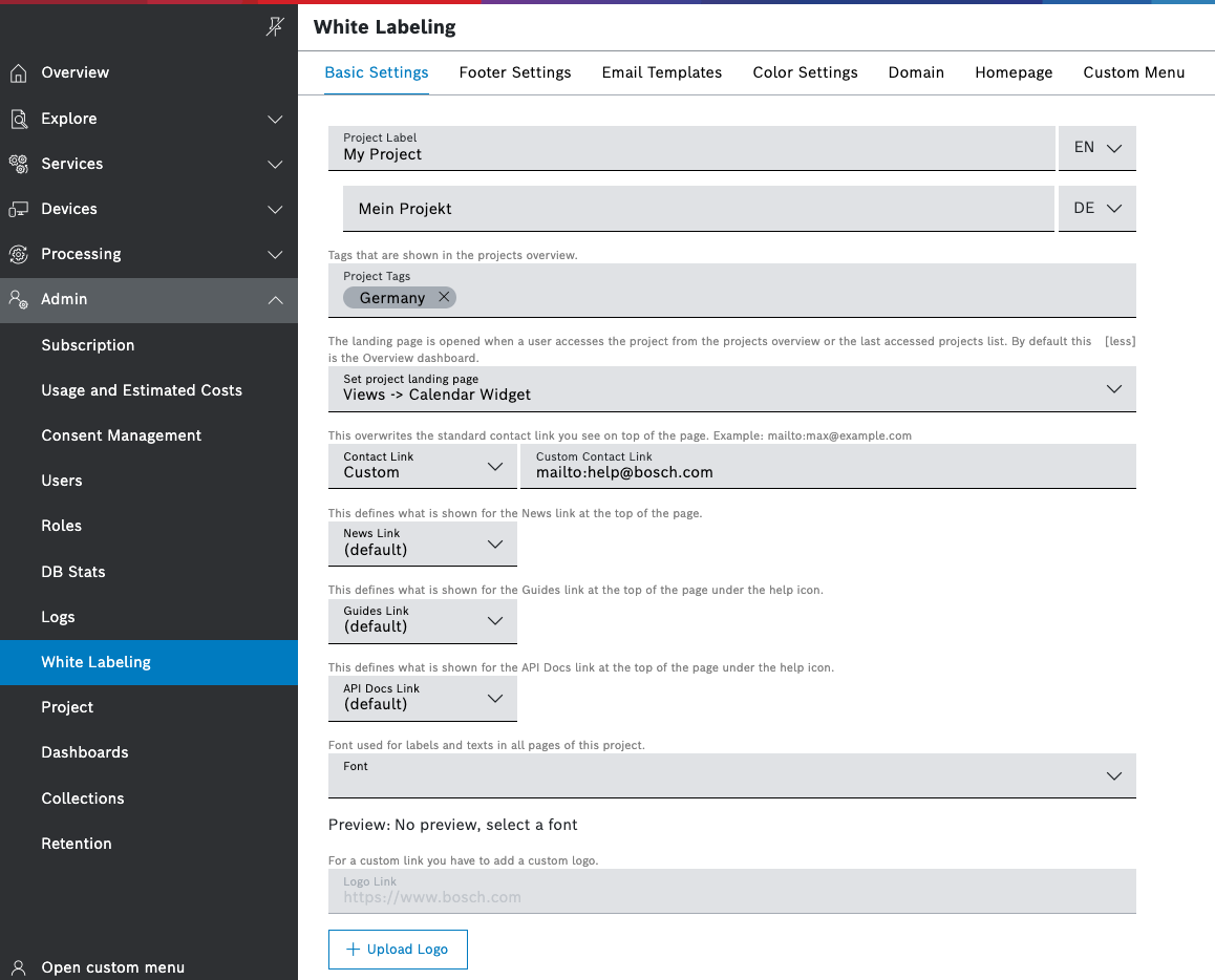 In White Labeling, Bosch IoT Insights allows you to make adjustments to the look and feel of your project.